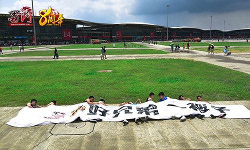 而在本次展会中最大的亮点,不得不提的就是蜀门“好兄弟一被子”了!在40度的高温天气下,十名蜀门的铁杆玩家自发组织了一场引起轰动的行为艺术。作为因《蜀门》而结识的好朋友,为了彰显彼此的友情,他们在炎热的天气下躺在地上,并在身上盖了一条长达十几米的大被子!上面六个醒目的大字“好兄弟,一被子”,并附上了蜀门八周年的LOGO,吸引了成百上千的玩家围观。